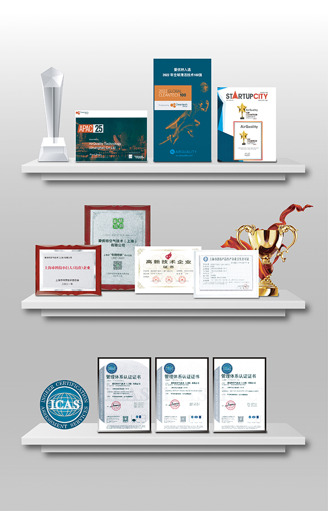 爱优特空气技术(上海)有限公司是上海市高新技术企业、专精特新企业、科技小巨人(培育)企业。2019年成功入选了CleanTech亚太地区清洁技术公司25强,2020年被StartupCity评为亚太区清洁技术Top10企业,2022年荣获Cleantech Group评选的全球清洁技术Top100企业殊荣。