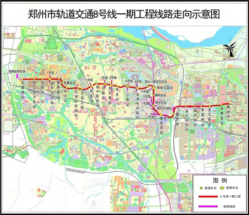 郑州地铁8号线是贯穿郑州东西方向的城市轨道交通骨干线路,西起高新区天健湖站,东至中牟县鲁庙站,串联了主城区与东部新城。