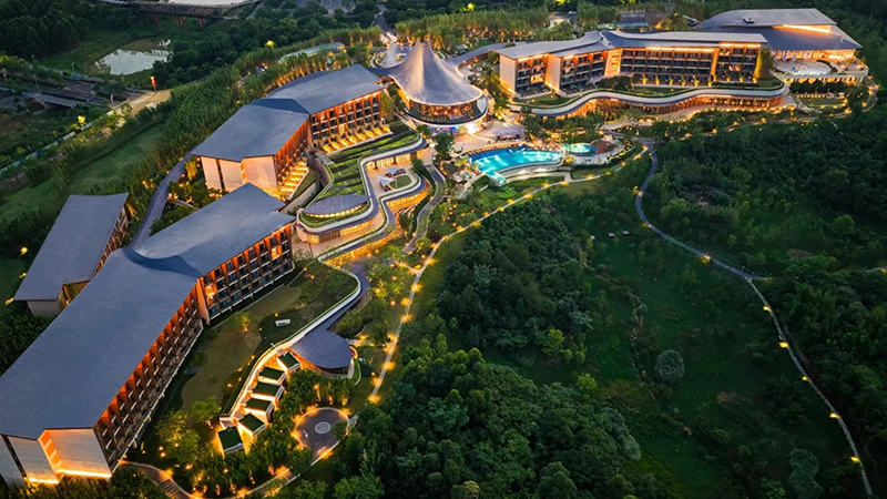度假村以“法适”理念为核心,提供一价全包式服务,配备儿童俱乐部、恒温水乐园及多项户外活动,其建筑设计灵感源自川西林盘,通过连廊系统串联各功能区,并设有地道四川火锅餐厅,为宾客打造多元度假体验。